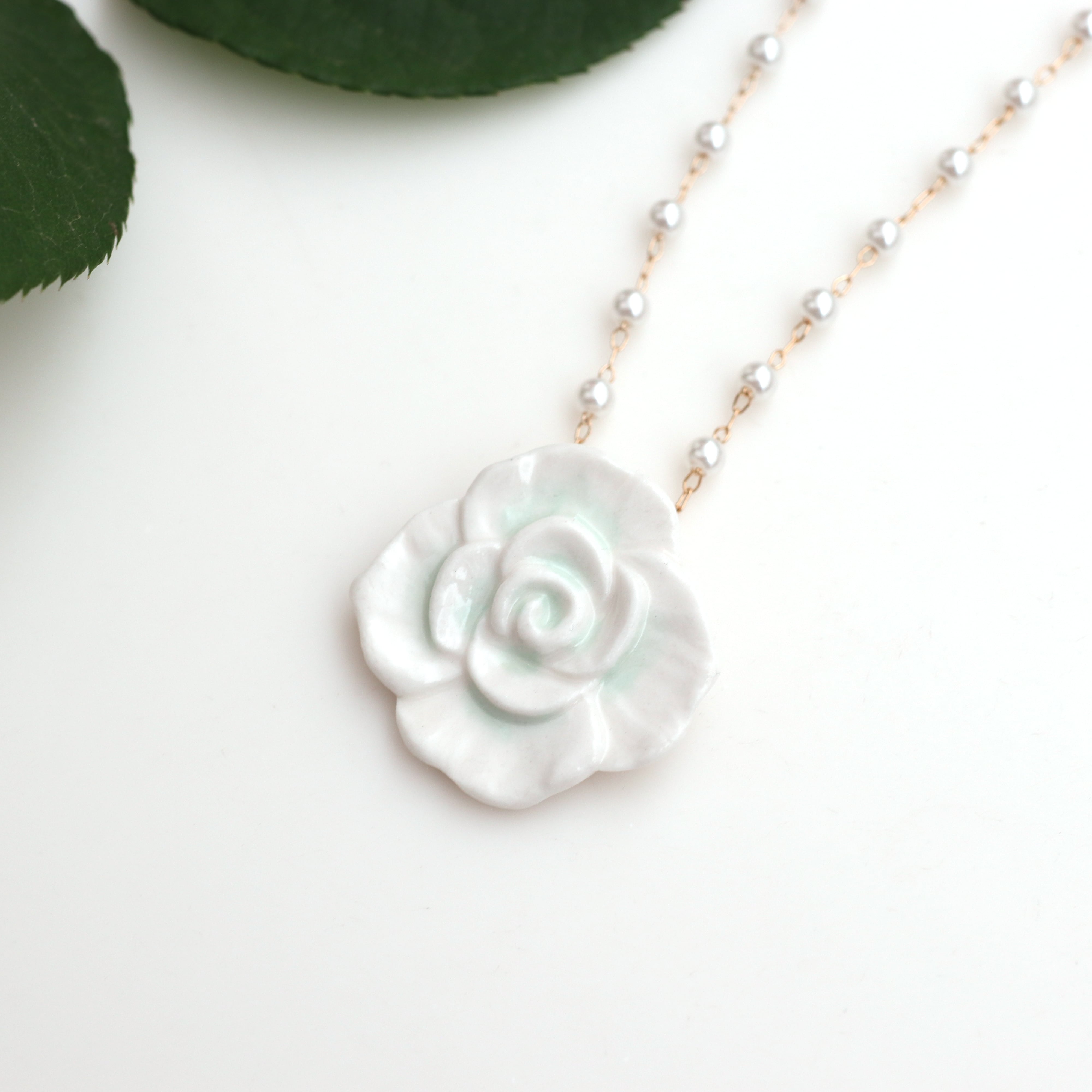 磁器製バラのパーツにパールチェーンを合わせました。